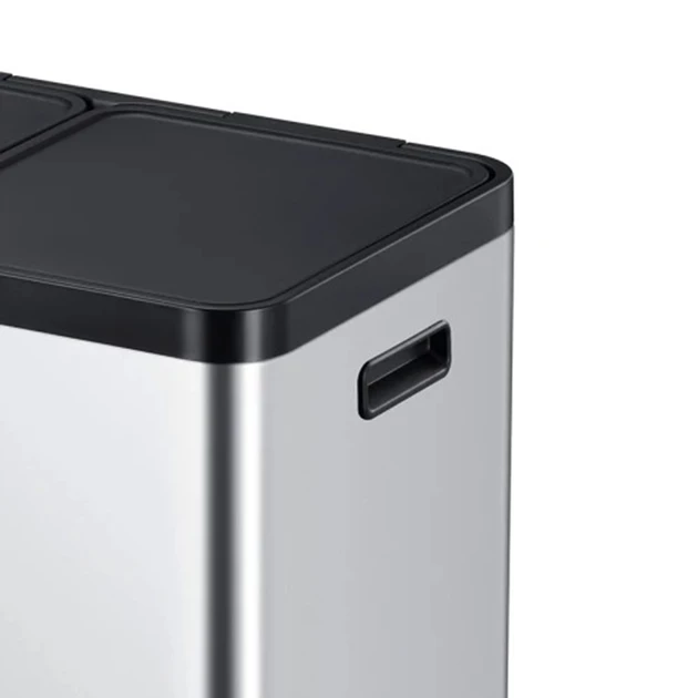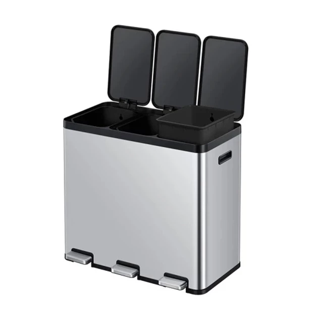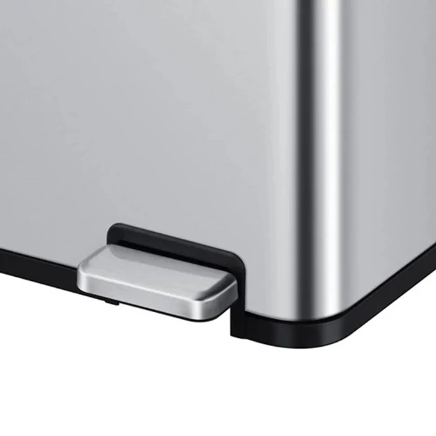 Deze stijlvolle rechthoekige pedaalemmer met 3 afvalstromen is uitgevoerd in geborsteld RVS met fingerprint proof coating. Voorzien van drie pedalen en drie binnenemmers van 20 liter (3x20L) voor eenvoudig afval scheiden. De deksels sluiten geruisloos en blijven dankzij de stay-open functie open bij schoonmaken of het wisselen van de zak. Pedalen zijn eenvoudig zelf te monteren.