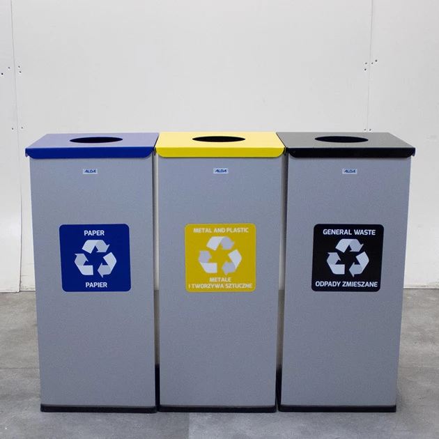 Deze set restpartij nieuwe afvalscheidingsbakken van ALDA is ideaal voor het efficiënt scheiden van afval in kantoor- of openbare ruimtes. De bakken zijn duidelijk gemarkeerd voor verschillende soorten afval: papier (blauw), metaal en plastic (geel), en restafval (zwart).