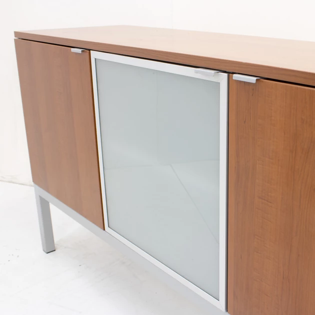 Zoekt u een praktisch en stijlvol dressoir? Dit gebruikte, houten dressoir heeft een melamine omhuizing en twee melamine draaideuren. De derde draaideur is van glas. Het dressoir bestaat uit drie compartimenten met elk één legbord.
