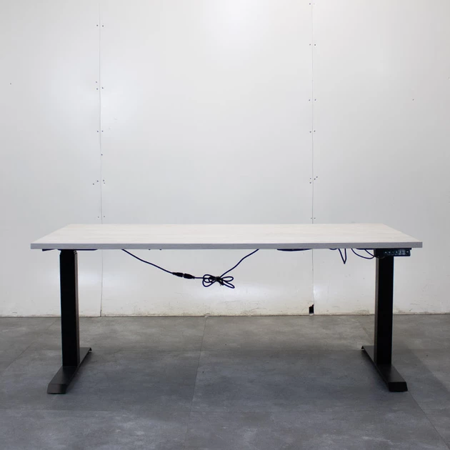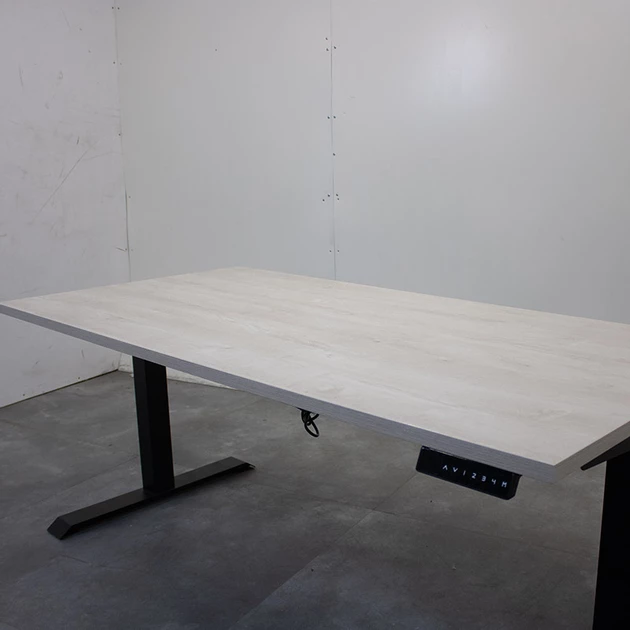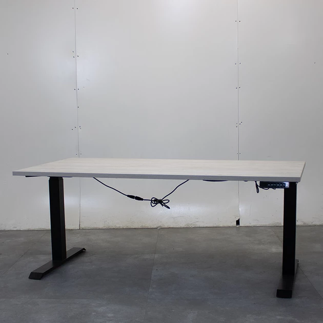 Dit gebruikte elektrisch zit-sta bureau heeft een stevig zwart metalen frame en een licht eiken bureaublad van 160 x 80 cm. De hoogte is eenvoudig elektrisch verstelbaar van circa 65 tot 130 cm met behulp van het bedieningspaneel met digitaal display en 4 geheugenstanden. Het blad is afgewerkt met een duurzame melamine toplaag en heeft een dikte van 2,5 cm.