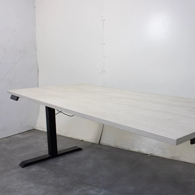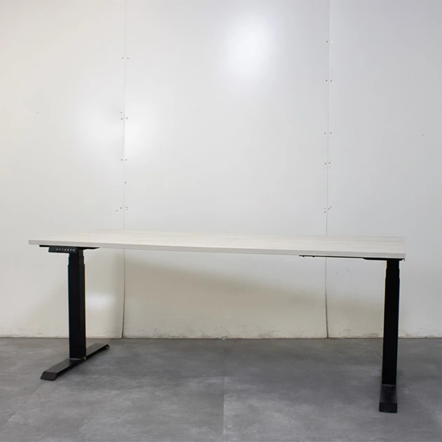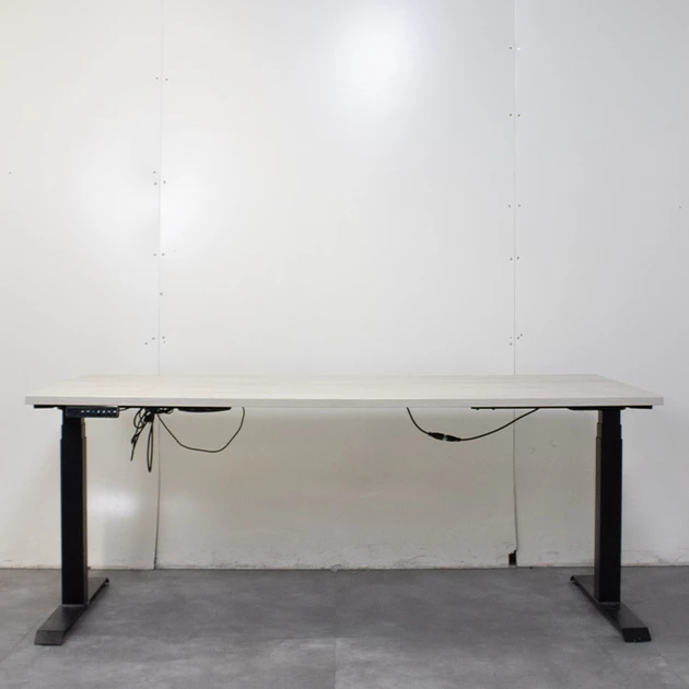 Breng flexibiliteit en comfort naar je werkplek met dit elektrisch in hoogte verstelbare zit-sta bureau. Het ruime werkblad van 180 x 80 cm is afgewerkt met een melamine toplaag in een stijlvolle licht eiken uitstraling en voorzien van een stevige ABS-stootrand. Het zwarte metalen T-poot onderstel zorgt voor stabiliteit en een moderne look.