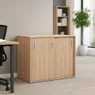 De kleinste uit de houten schuifdeurkasten-familie: deze lage schuifdeurkast van 74cm hoog. Het grote voordeel aan dit formaat is dat u deze kast als verlengstuk van uw bureau kunt gebruiken. Zo heeft u én een groter werkblad, én extra opbergruimte bij uw werkplek. Win-win!