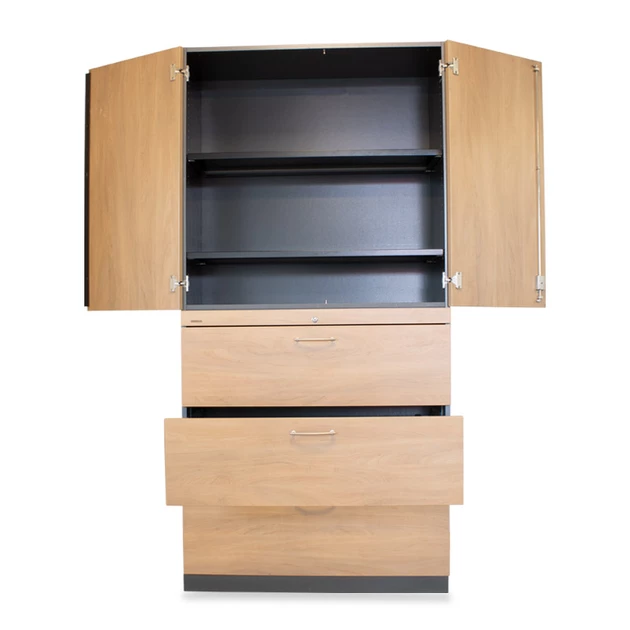 De gebruikte houten kast Gesika heeft een omhuizing van melamine in het antraciet. Het bovenste deel van de kast bevat draaideuren met een indeling van 2 legborden. Het onderste deel bestaat uit 3 hangmappenladen.