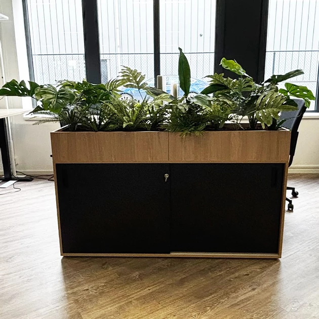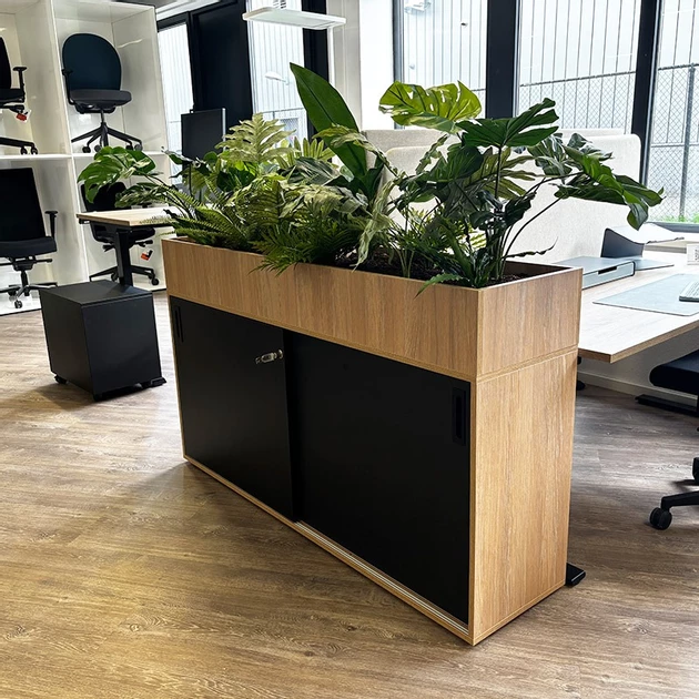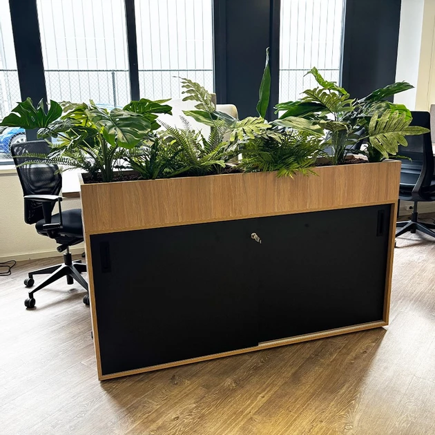 De kleinste uit de houten schuifdeurkasten-familie: de lage schuifdeurkast van 74cm hoog. Deze variant is uitgevoerd met een plantenbak waardoor het kantoor aangekleed kan worden met planten! Daarnaast fungeert deze kast al afscheiding aan de kopsekant van het bureau én biedt het praktische opbergruimte bij de werkplek. Dit geld zowel voor de enkele bureaus met een diepte van 80cm, als voor de duo bureau's met een totale diepte van zo'n 160cm.