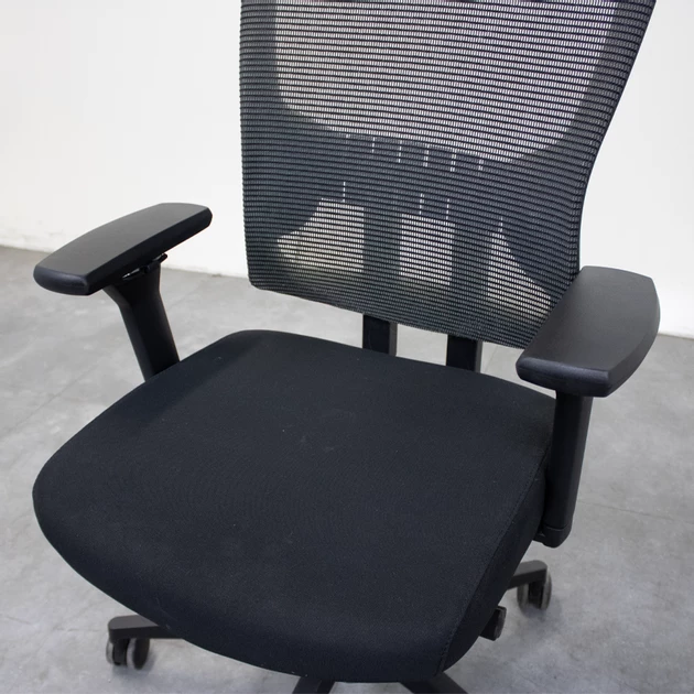 De gestoffeerde zitting is verstelbaar in zowel hoogte als diepte, waardoor de stoel eenvoudig kan worden afgestemd op verschillende gebruikers. Het synchroonmechaniek met gewichtsinstelling en rugvergrendeling volgt de natuurlijke beweging van het lichaam en ondersteunt een actieve zithouding.