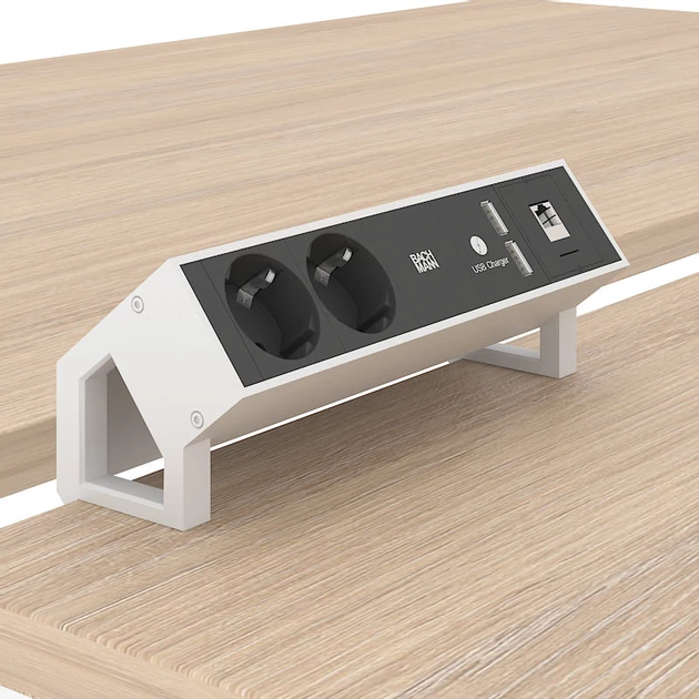 Het witte Bachmann powerdock is speciaal ontworpen om op uw bureaublad gemonteerd te worden. De standaard configuratie waarmee het powerdock geleverd wordt is: 2x Stroom, 2x USB en 1x LAN.